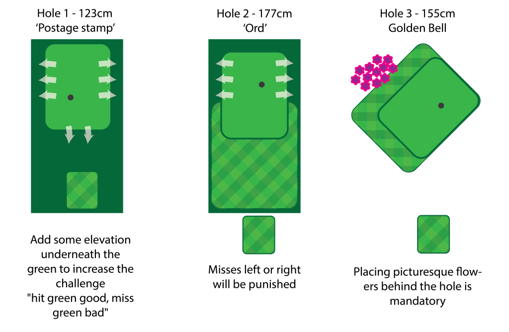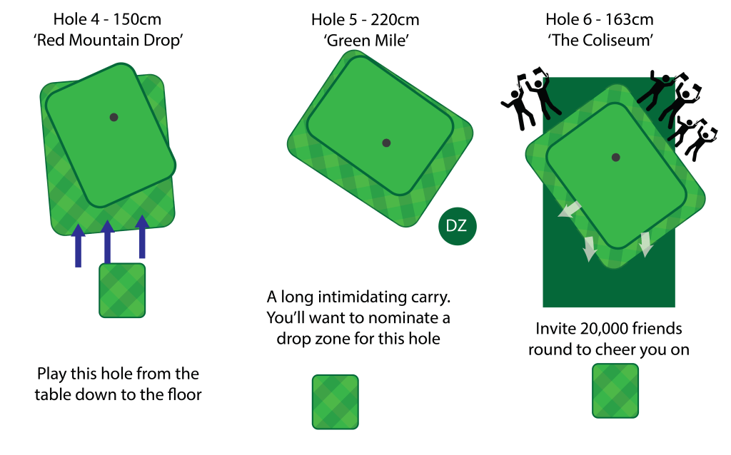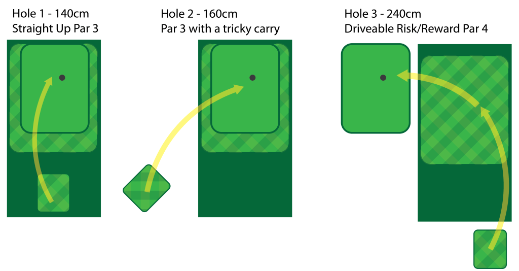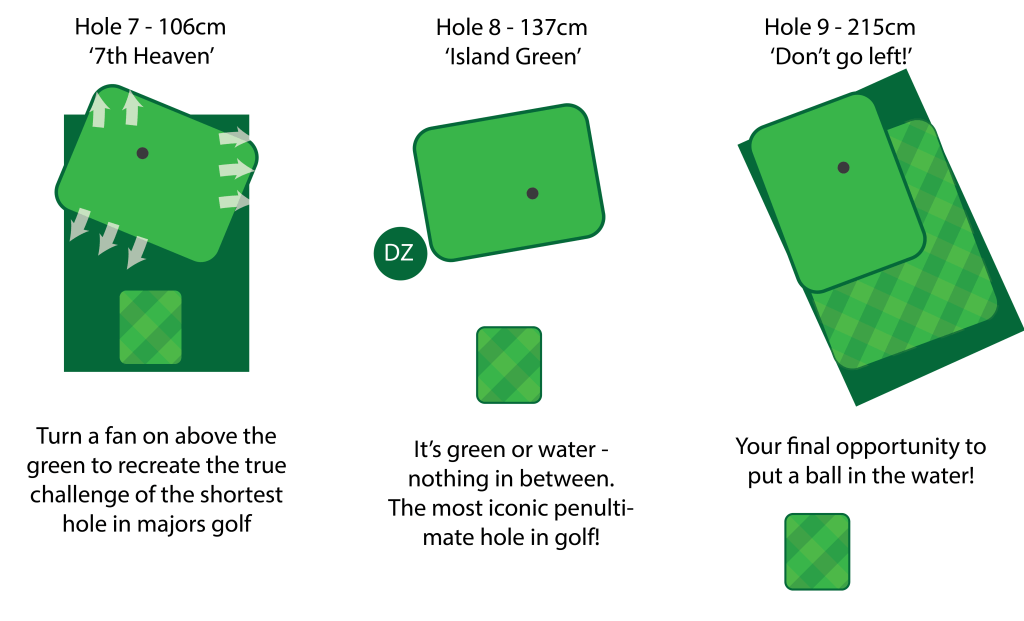 We have used variations on this simple setup at the British Golf Show, the UK Games Expo, The Michigan Golf Show and the Northeast Golf Show and in just 3 holes the drama that can be generated is amazing.
